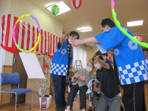 「職員が少なくて準備を手伝ってもらうこともままならず、自分達で仕事の合間を見つけて準備しました」とイベント委員。ひと昔前なら前日、前々日に職員総出で準備していましたが、現在は何日かに分散してお祭りの準備をしている状況が見て取れます。それでもご利用者様に普段とは違う何かを味わっていただければとの思いで準備したのだそうです。