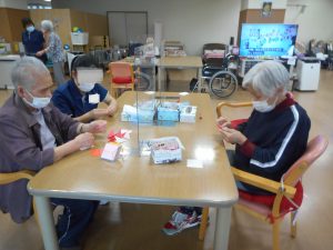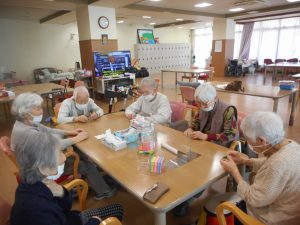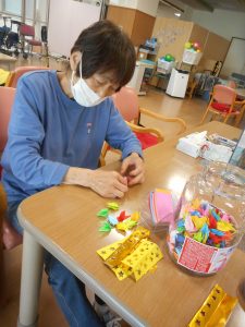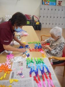 繋げる作業も一苦労・・・鶴の配色を考え、利用者様と一緒に数を揃えて順番に並べていきます。