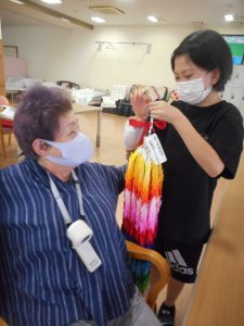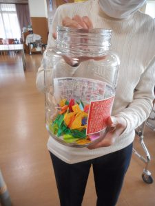 ご利用者と鶴を折りながら「世界が平和に…」「みんなが笑顔で過ごせるように」とたくさんの小さな思いや願いが平和に繋がるという思いで千羽繋げて完成しました。