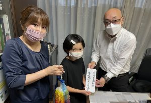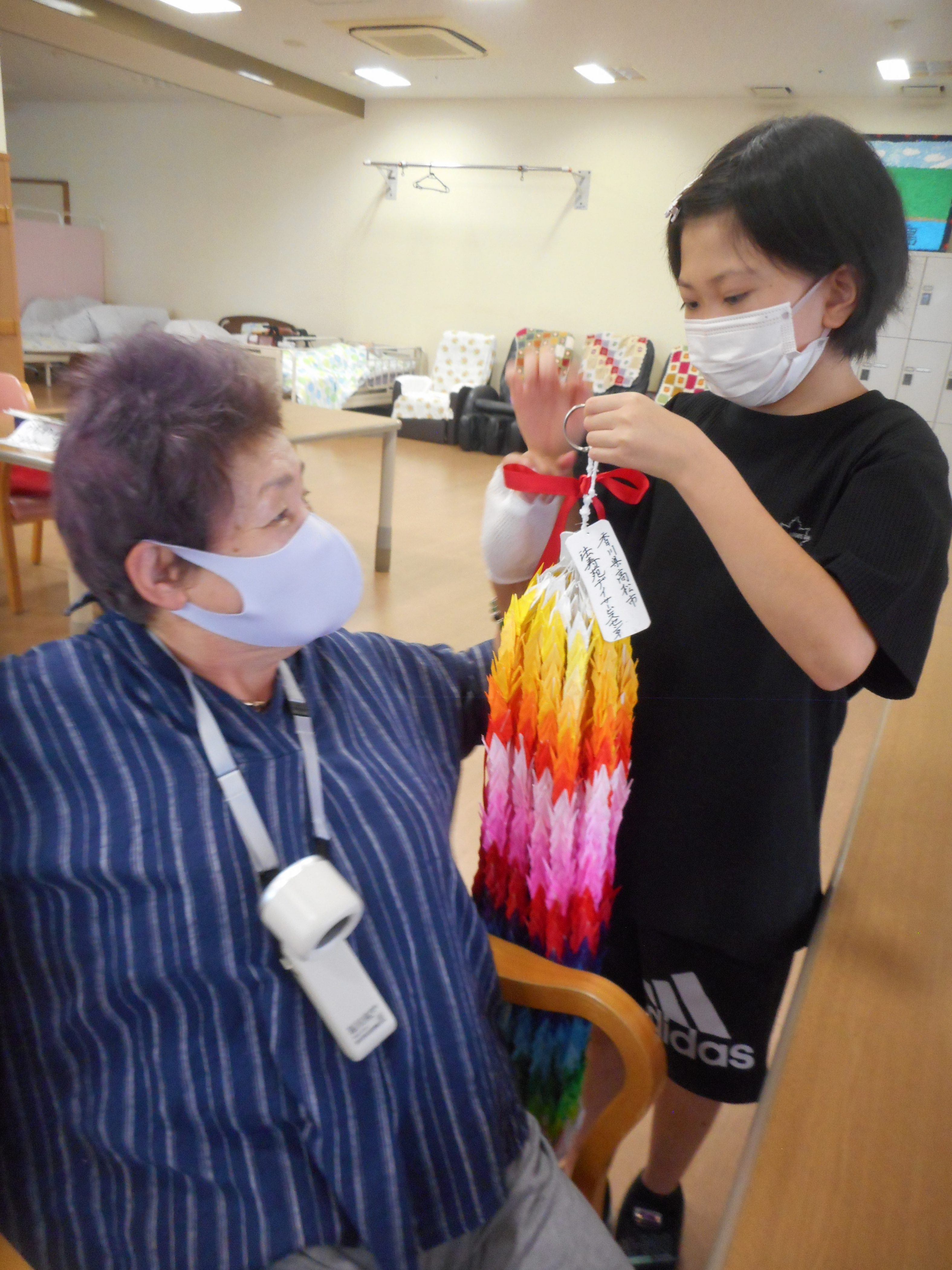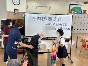 特別養護老人ホーム法寿苑の職員のお子さんが通う小学校で、この10月に戦争や平和を学ぶ平和学習のため広島へ行く、と聞き、デイサービスの利用者様が折った千羽鶴も一緒に届けてもらうことにしました。