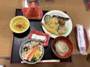 赤飯やチラシ寿司、天ぷらも沢山ある中から選び、最後はデザートを選びました。