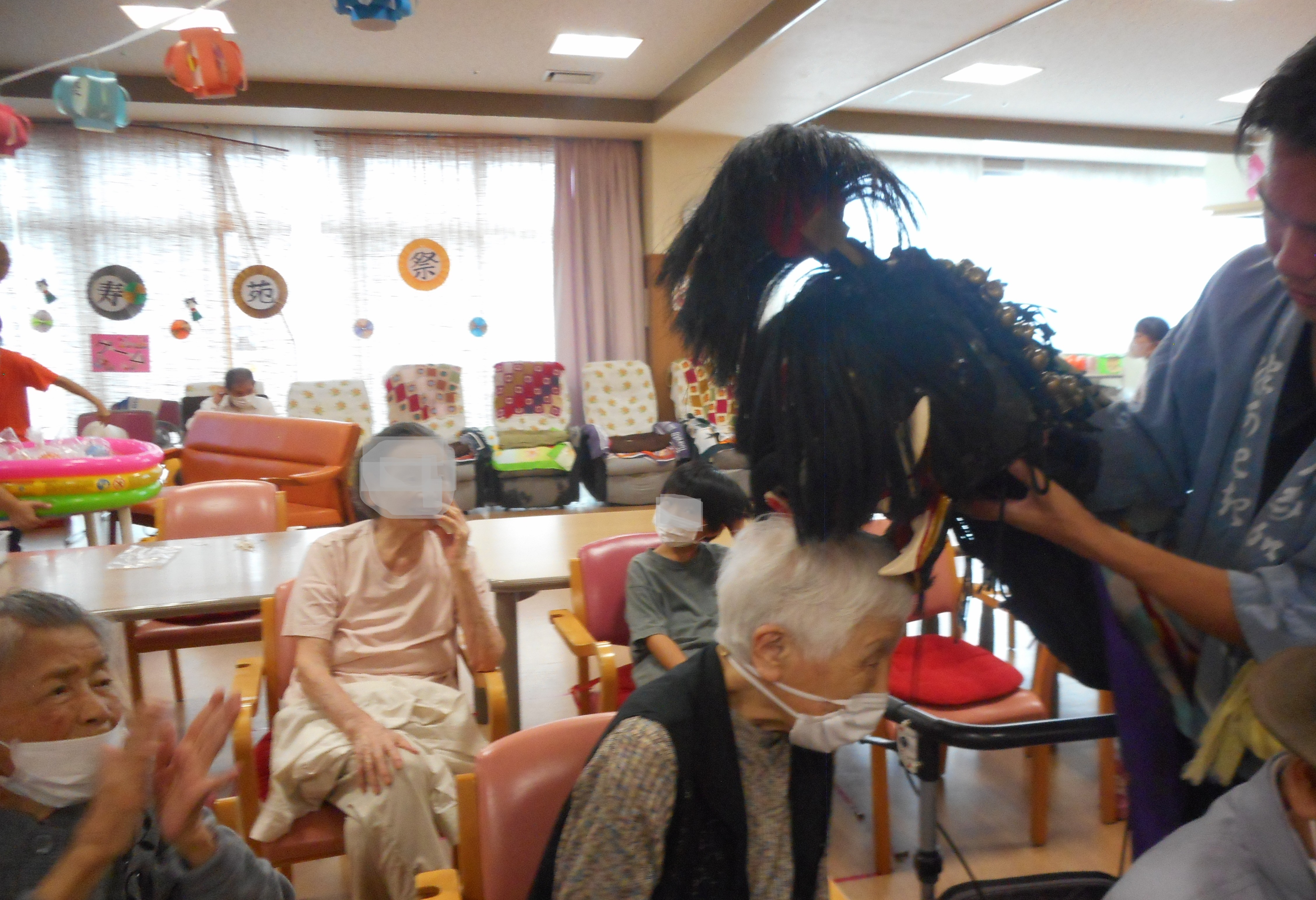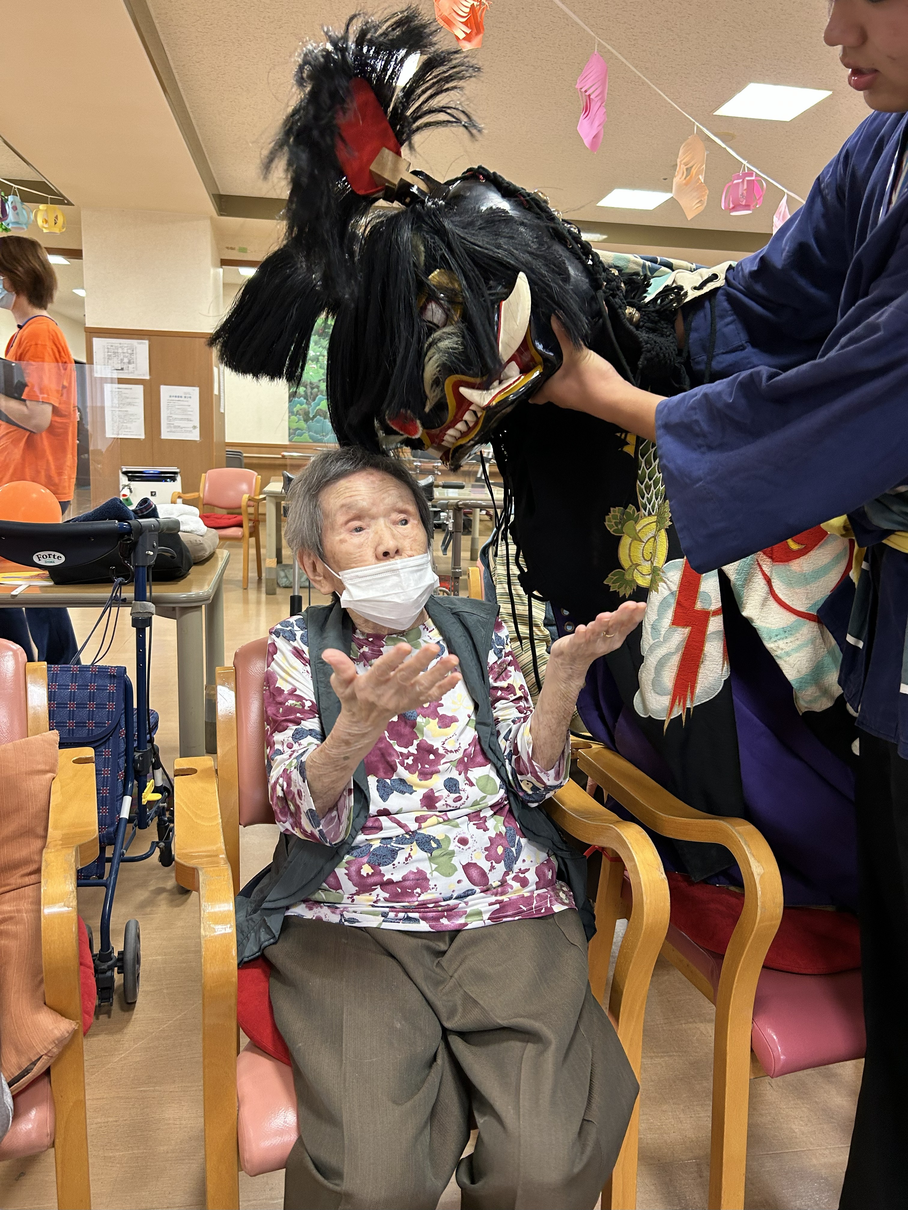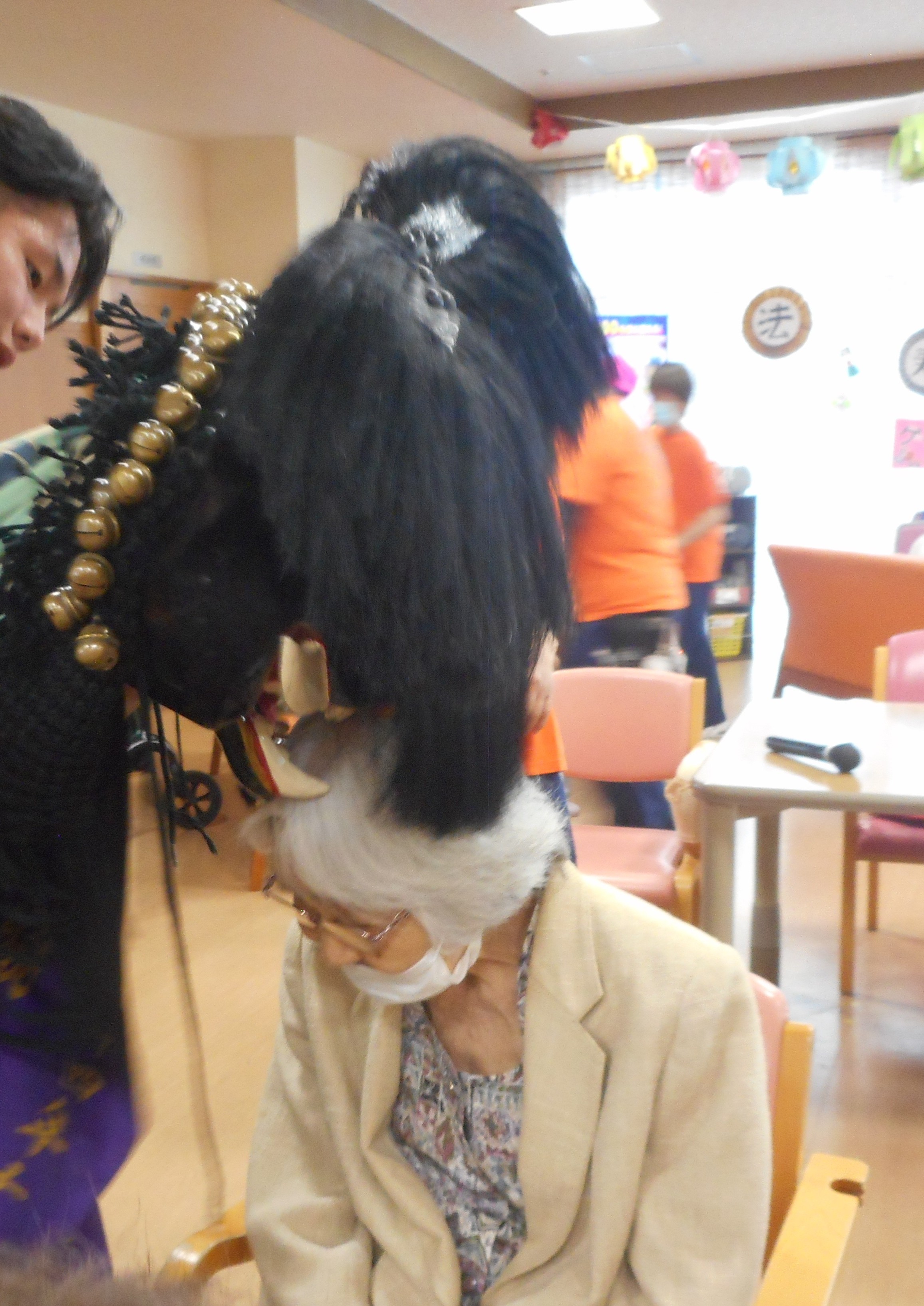 最後は、無病息災、健康で過ごせますように、との願いを込めて、ご利用者様全員の頭に獅子がガブリ!!