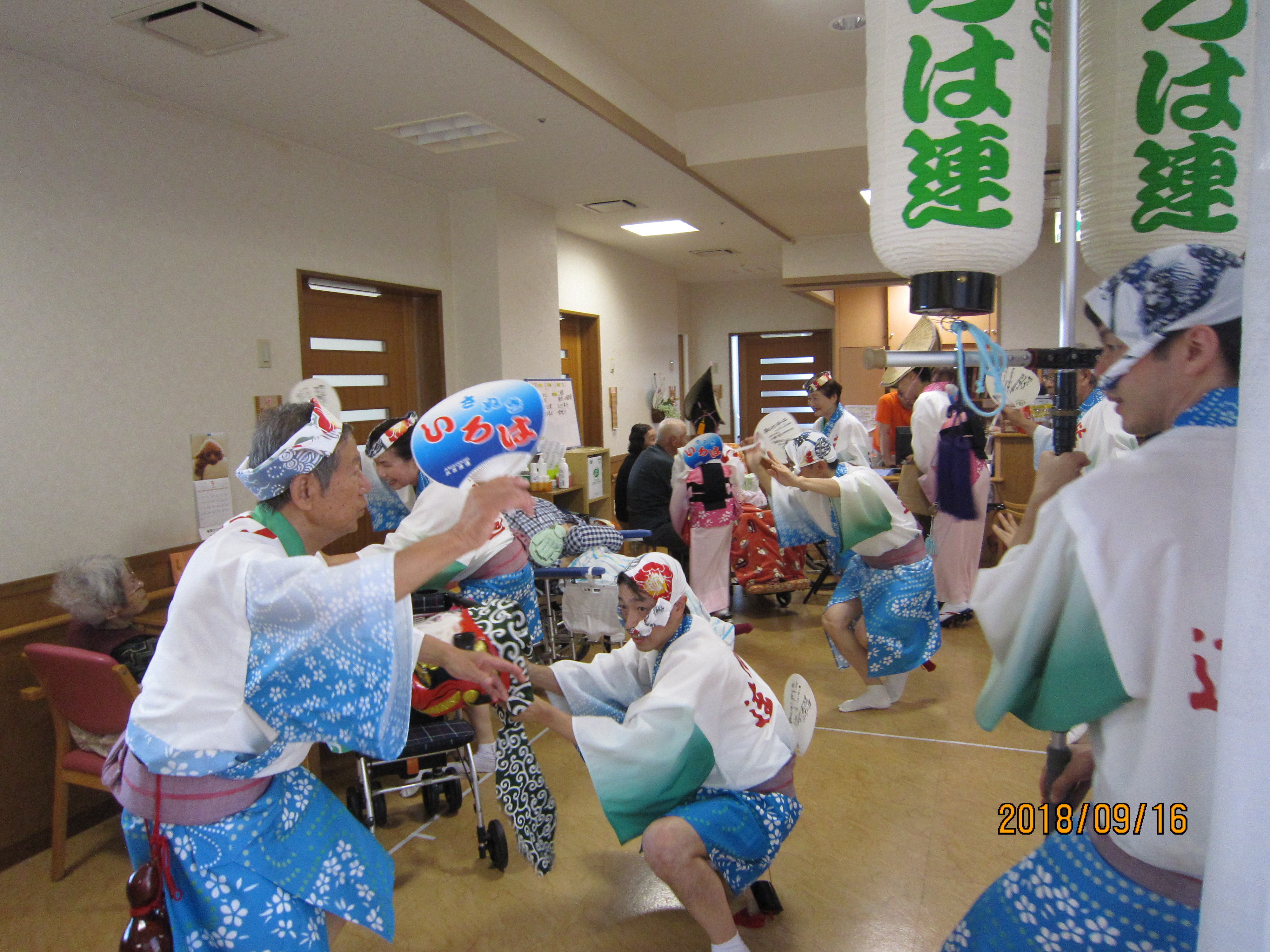 次に「宴の部」は、さぬきいろは連様による阿波踊りが、特養ユニットまで廻りました。一人一人の入居者様へ折鶴を手渡しながらの本格的な踊りに感動して涙を流される方もおられました。