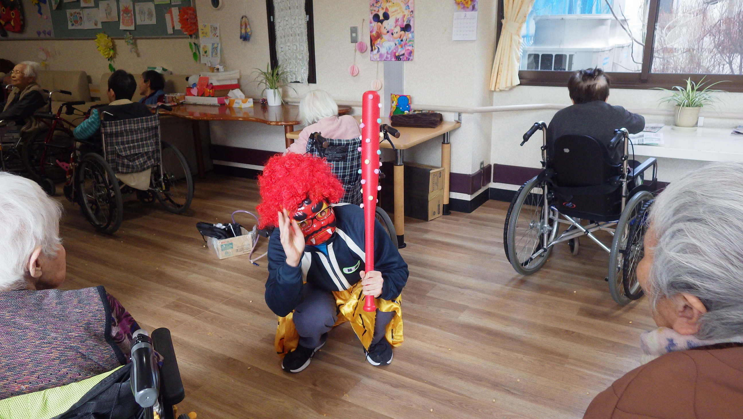 2月2日(金)、弘恩苑の特養フロアで節分豆まきを行いました。季節の分かれ目「節分」・・・春を迎え、利用者様の益々の無病息災を願って鬼払いです(^^)/