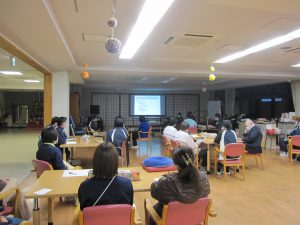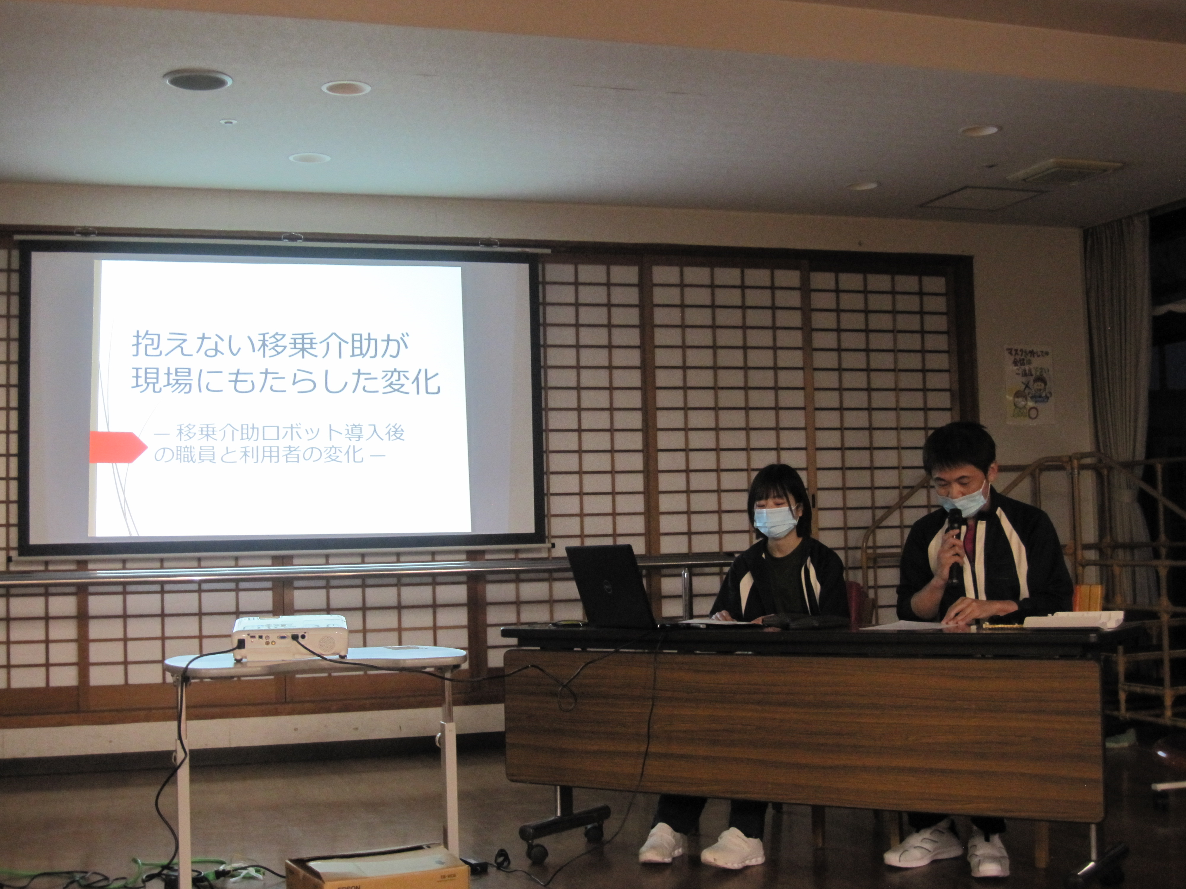 弘恩苑は昨年介護ロボットを導入しました。これらロボットの導入前と導入後における変化と成果、それから今後の課題について約15分かけて職員の前で発表してもらいました。