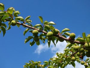 弘恩苑の中庭にある梅の木です。年明けから可愛らしい花をつけて、利用者さんや職員の目を楽しませてくれましたが、今の時期はたくさんの実をつけています。
