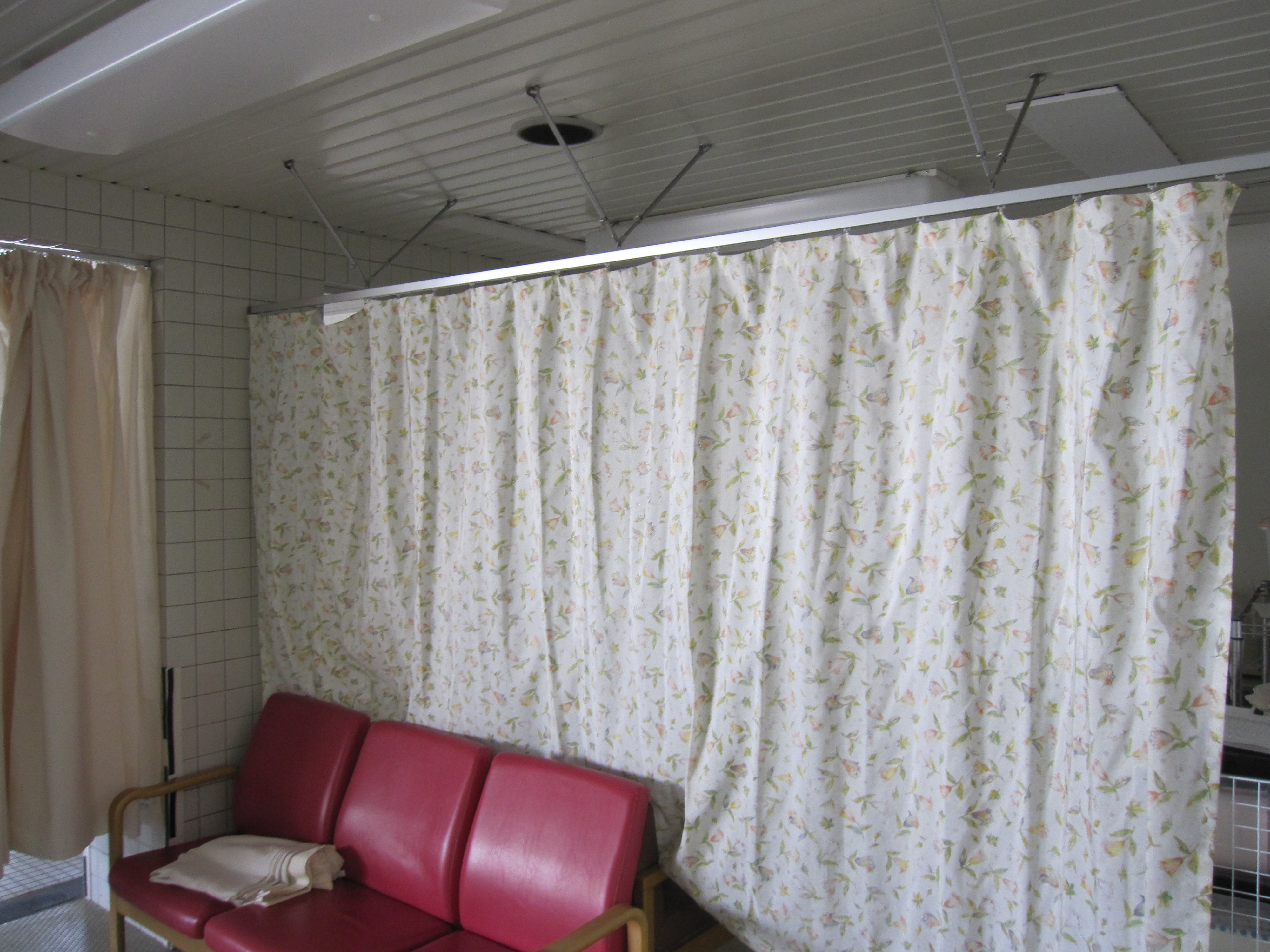 次に居室の間仕切りカーテン。多床室ならではの交換作業です。