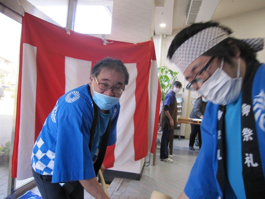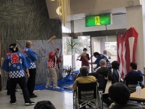 その場にいた職員、利用者様に「一緒にやろ?」と声をかけSスタッフ、看護師のAナースも駆り出されます。ついには、この日、餅つきに参加しない予定の事務長とOスタッフまで参戦し、なんとか3臼をつき終えました。