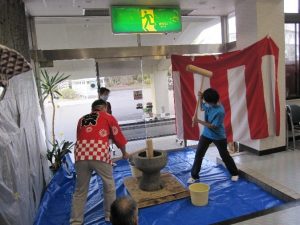 この日は4名の女性スタッフ、2名のご利用者様と事務長の助けもあり3臼をつく事が出来ました。