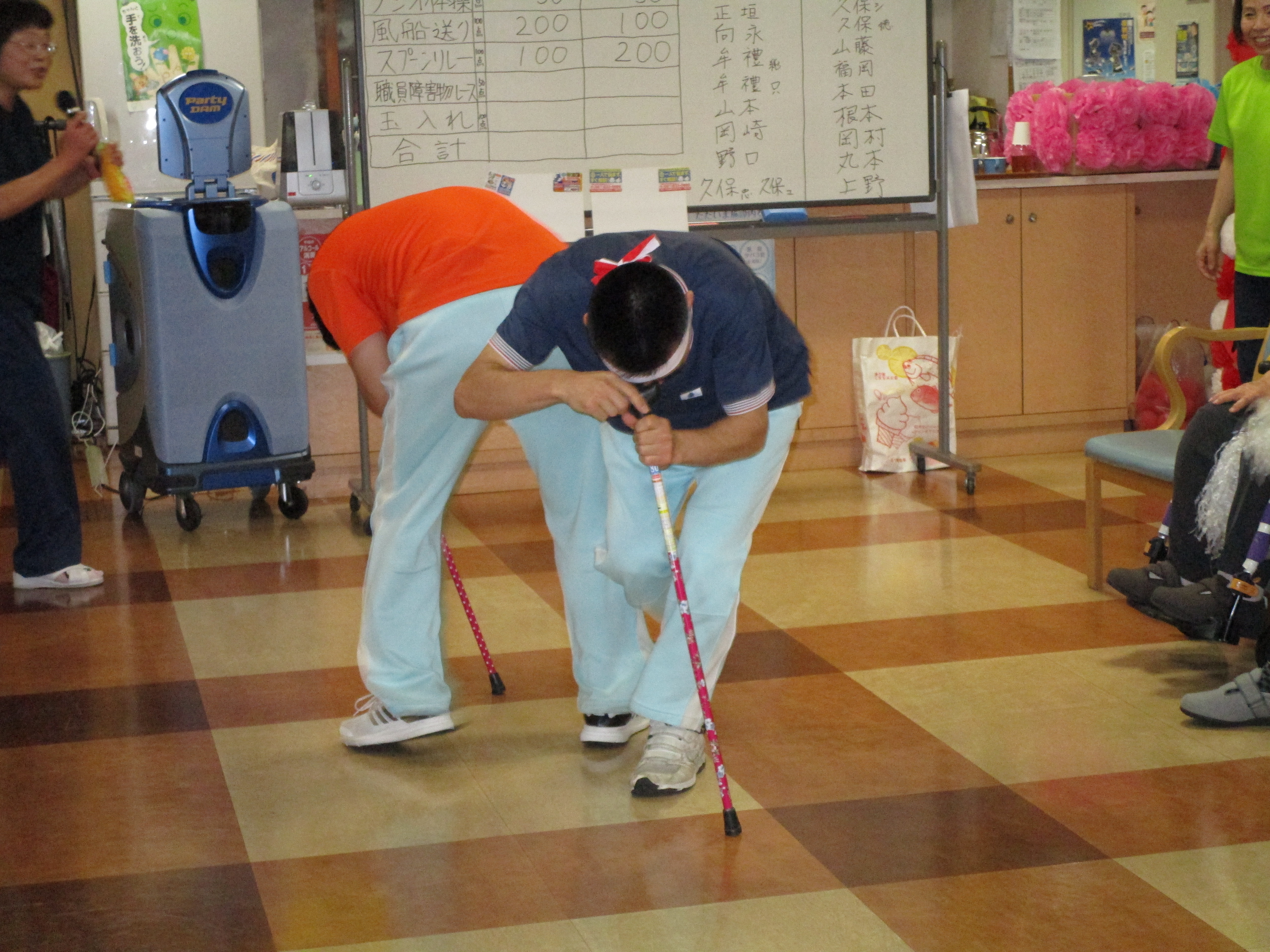 もうお分かりですね?玉入れのカゴは利用者様の前まで職員が移動させます(笑)