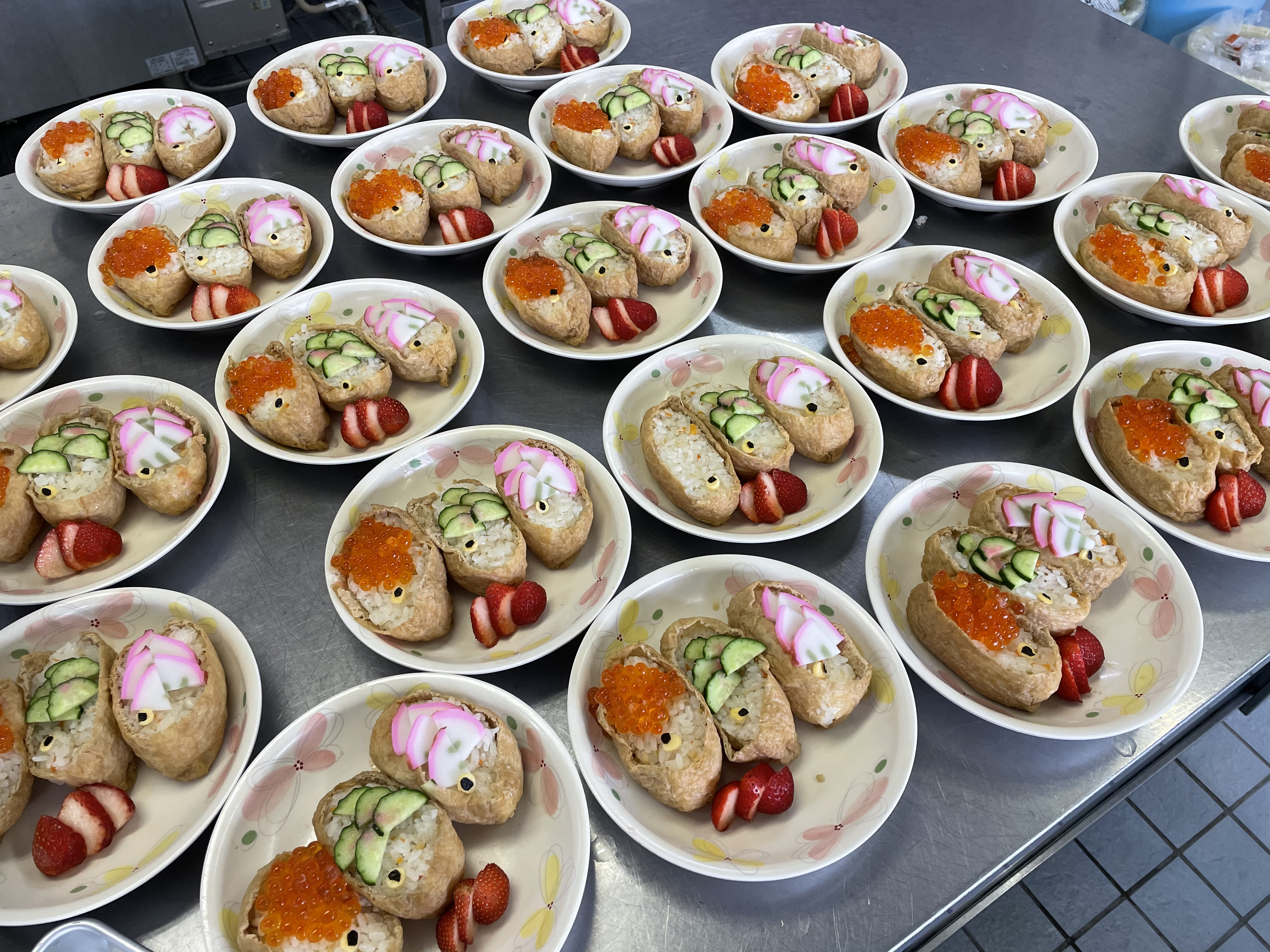 特別養護老人ホーム香色苑では外出することが難しい中、入居者の皆様に少しでも季節感を楽しんでいただこうと端午の節句にちなんで稲荷寿司で鯉のぼりを作りました~♪