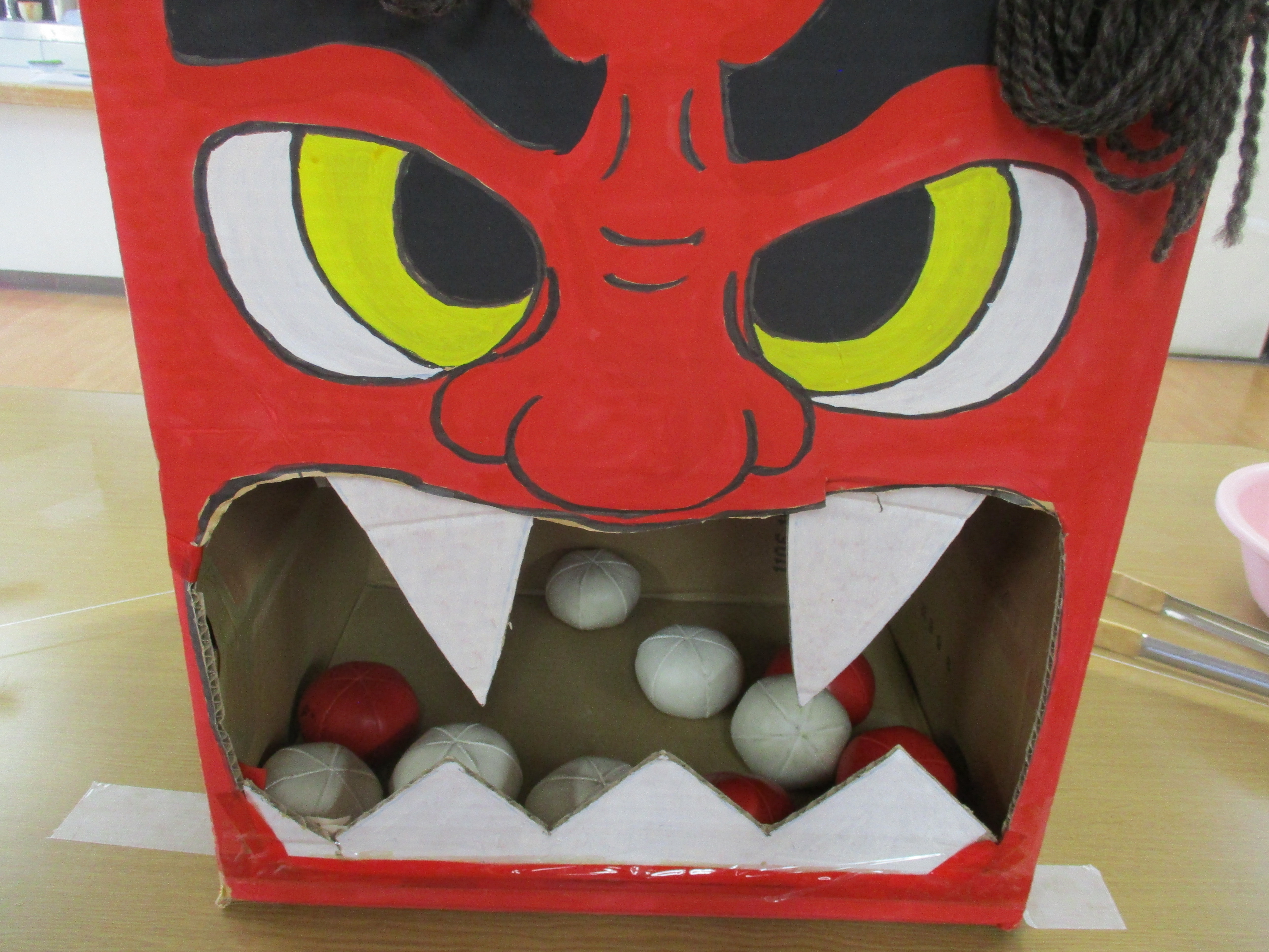 大きな鬼の口めがけて自分のチームの色玉を投げ入れますっ!