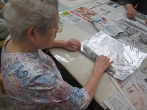 長細く丸めた新聞紙にアルミホイルを巻いていきます。