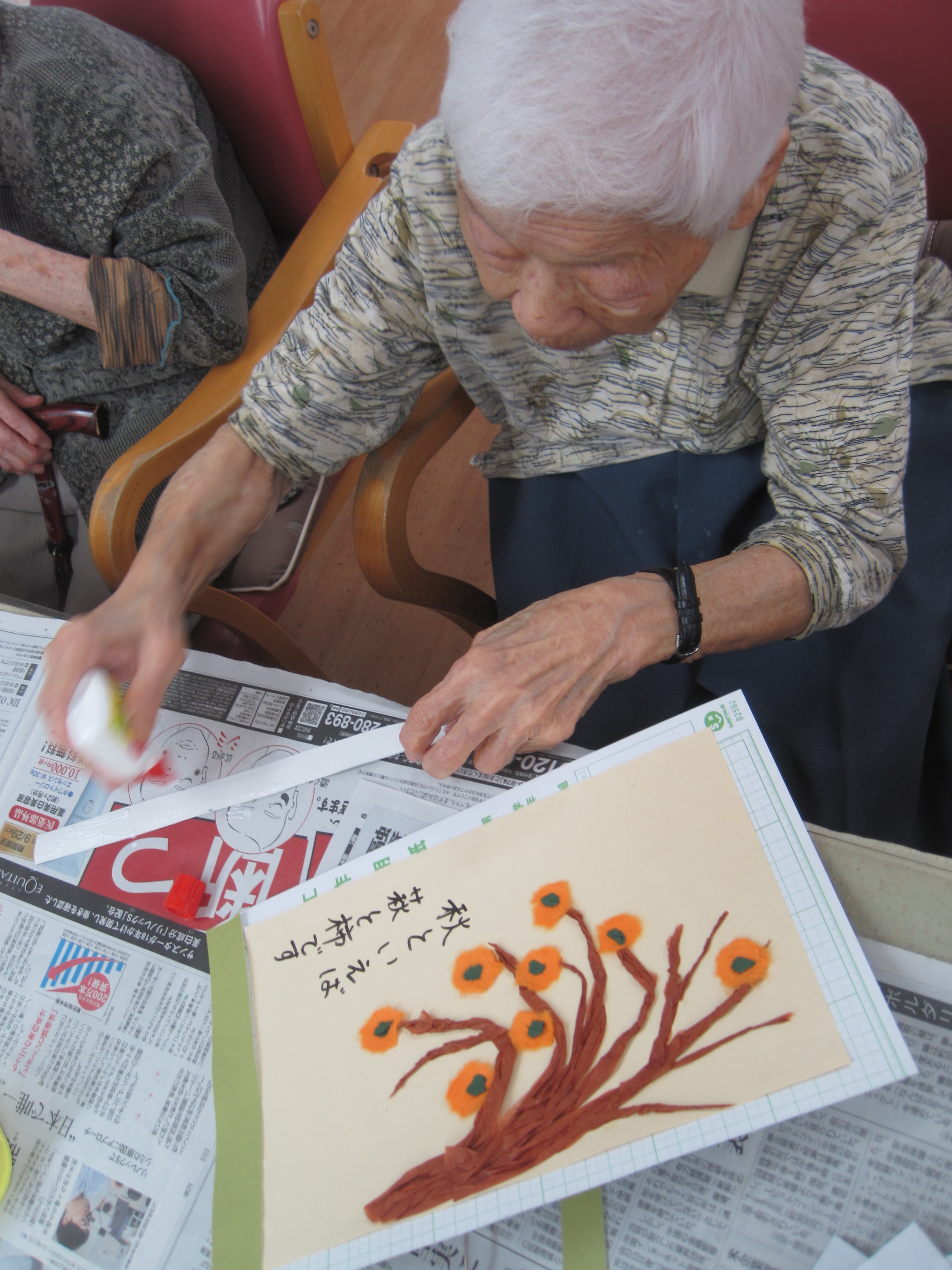 デイサービスの大きな柿の木の壁画を、小さな壁飾りにして、ご自宅にも持って帰りましょう♪