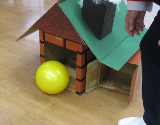 白い袋に入ったたくさんのプレゼントを、蹴ったり投げたりして、このお家に入れて頂くゲームです。