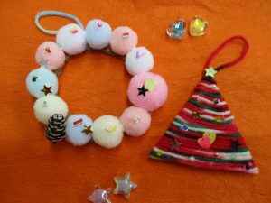 こちらのお二人は、毛糸を巻いたツリーに最後の飾りつけ中ですっ。