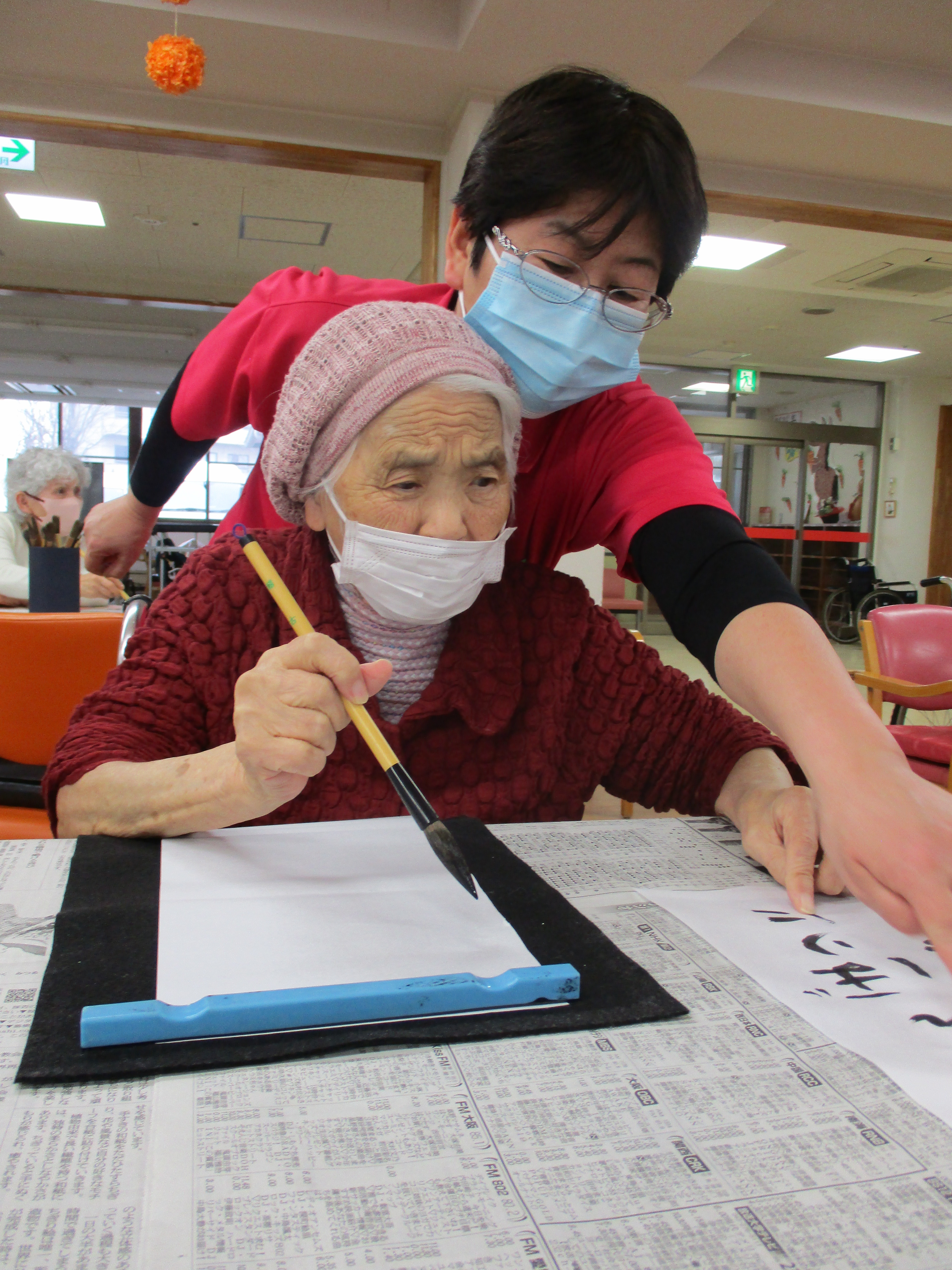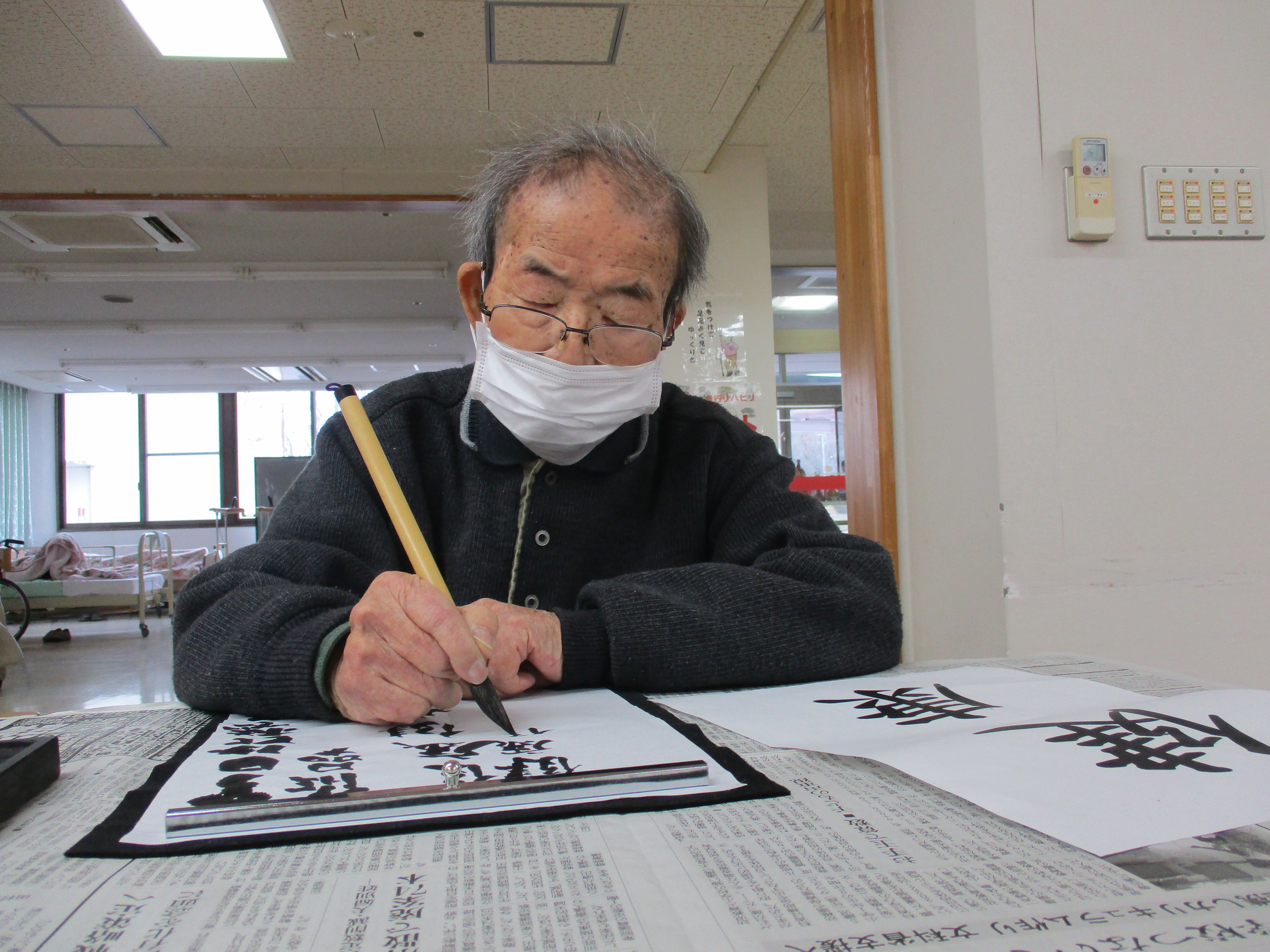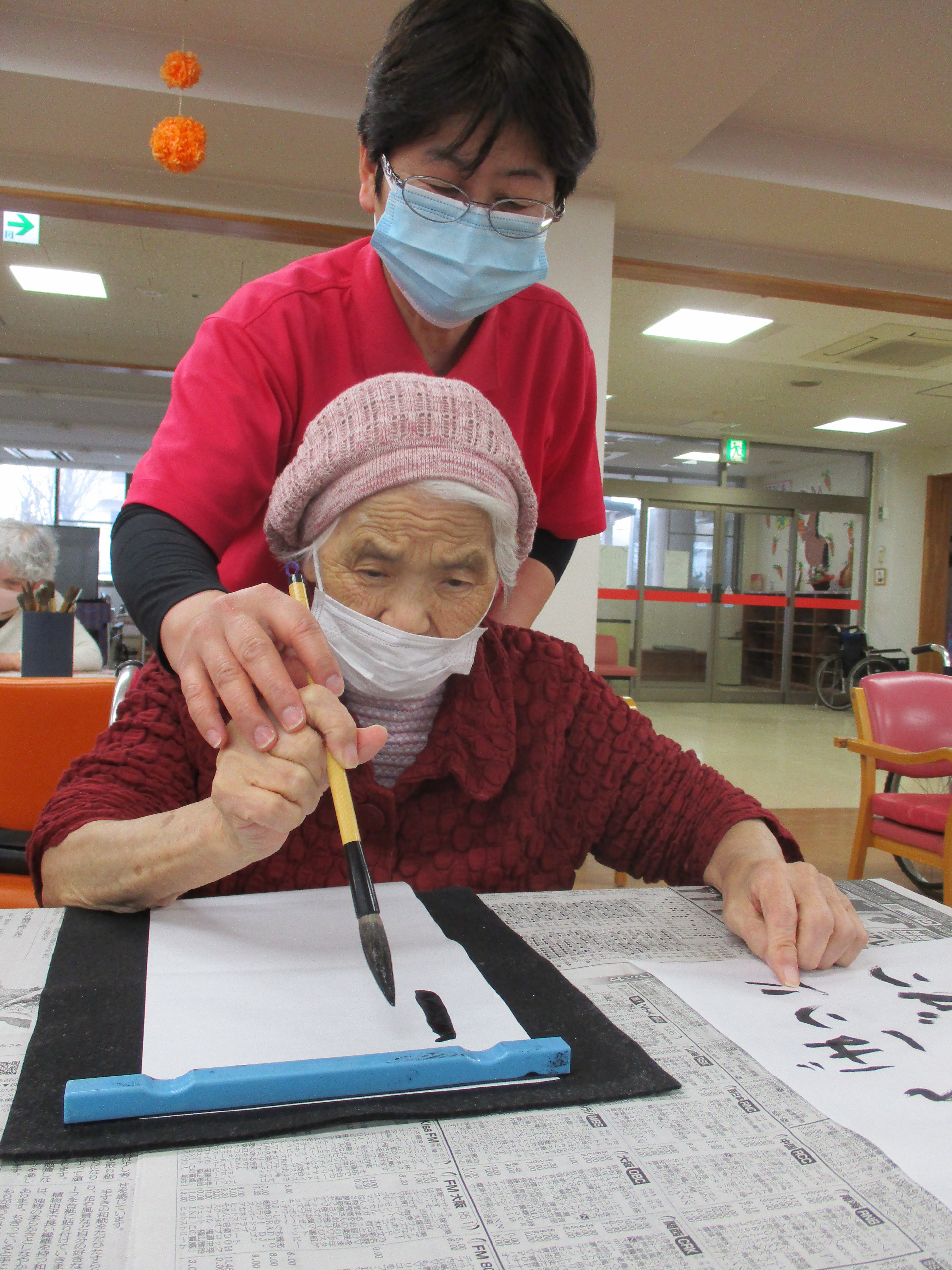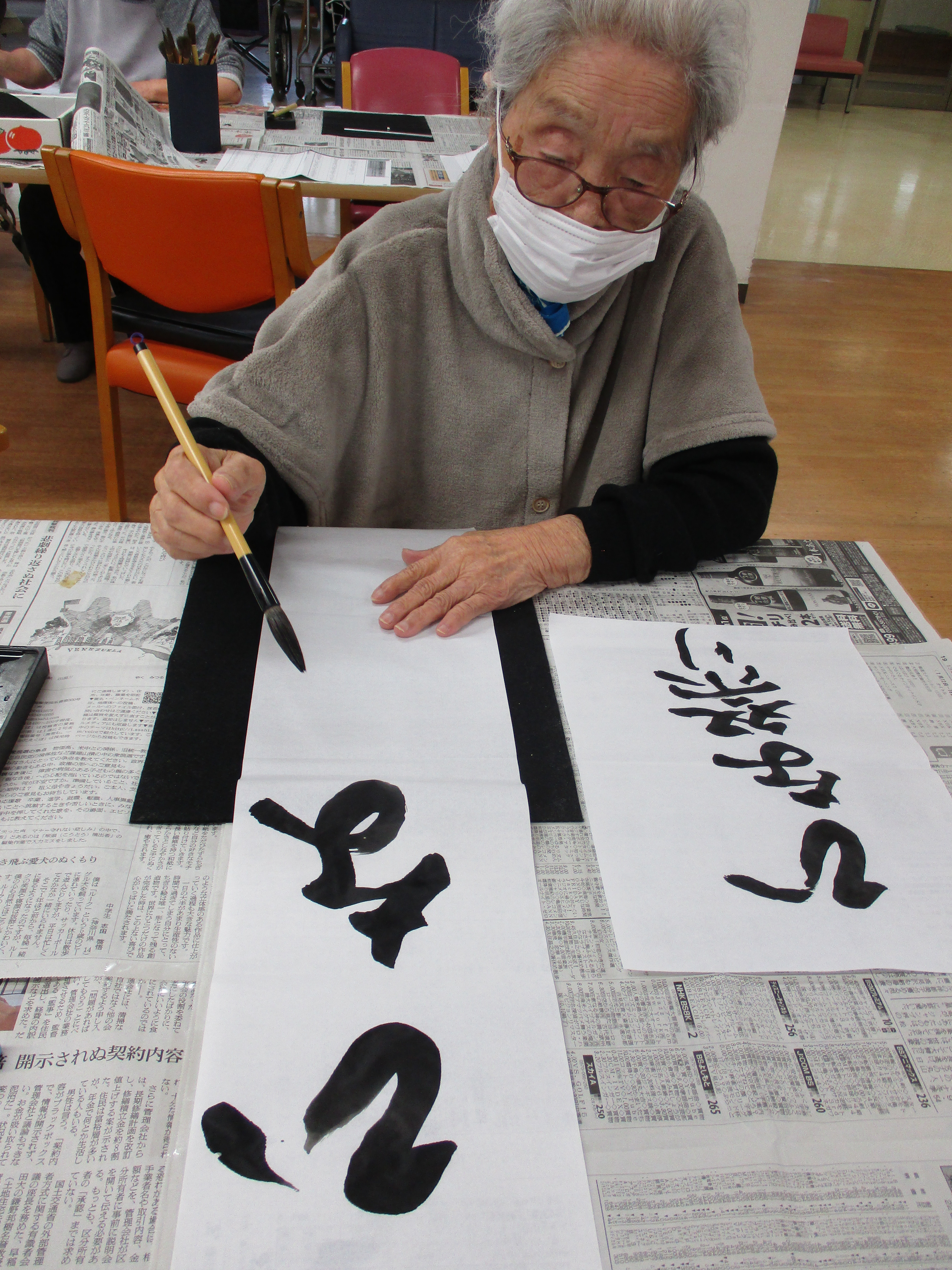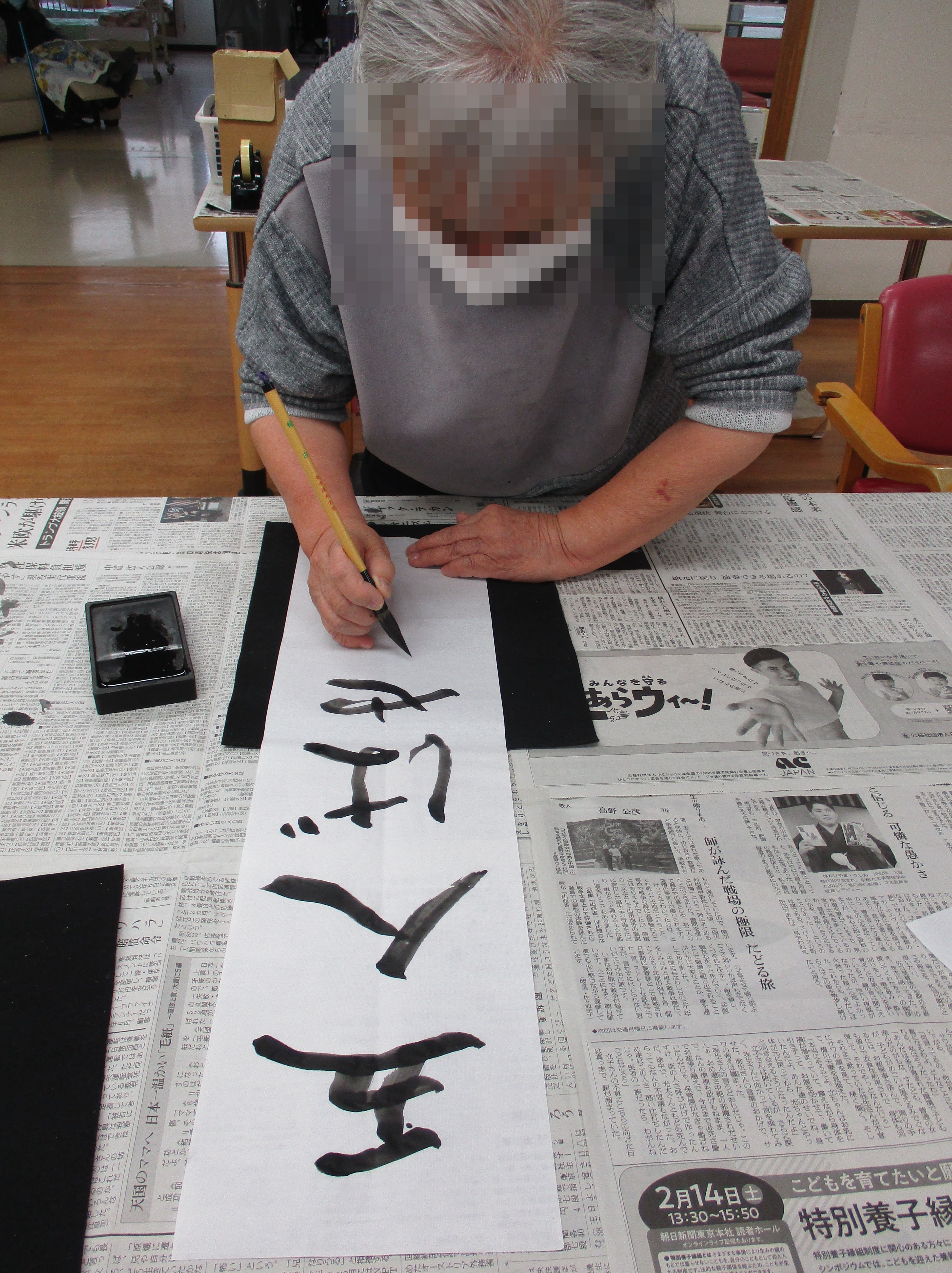 ご自分の椅子でゆっくり過ごされていたTさん。書道のお声掛けをすると「書いてみようか。」とおっしゃって下さいました。