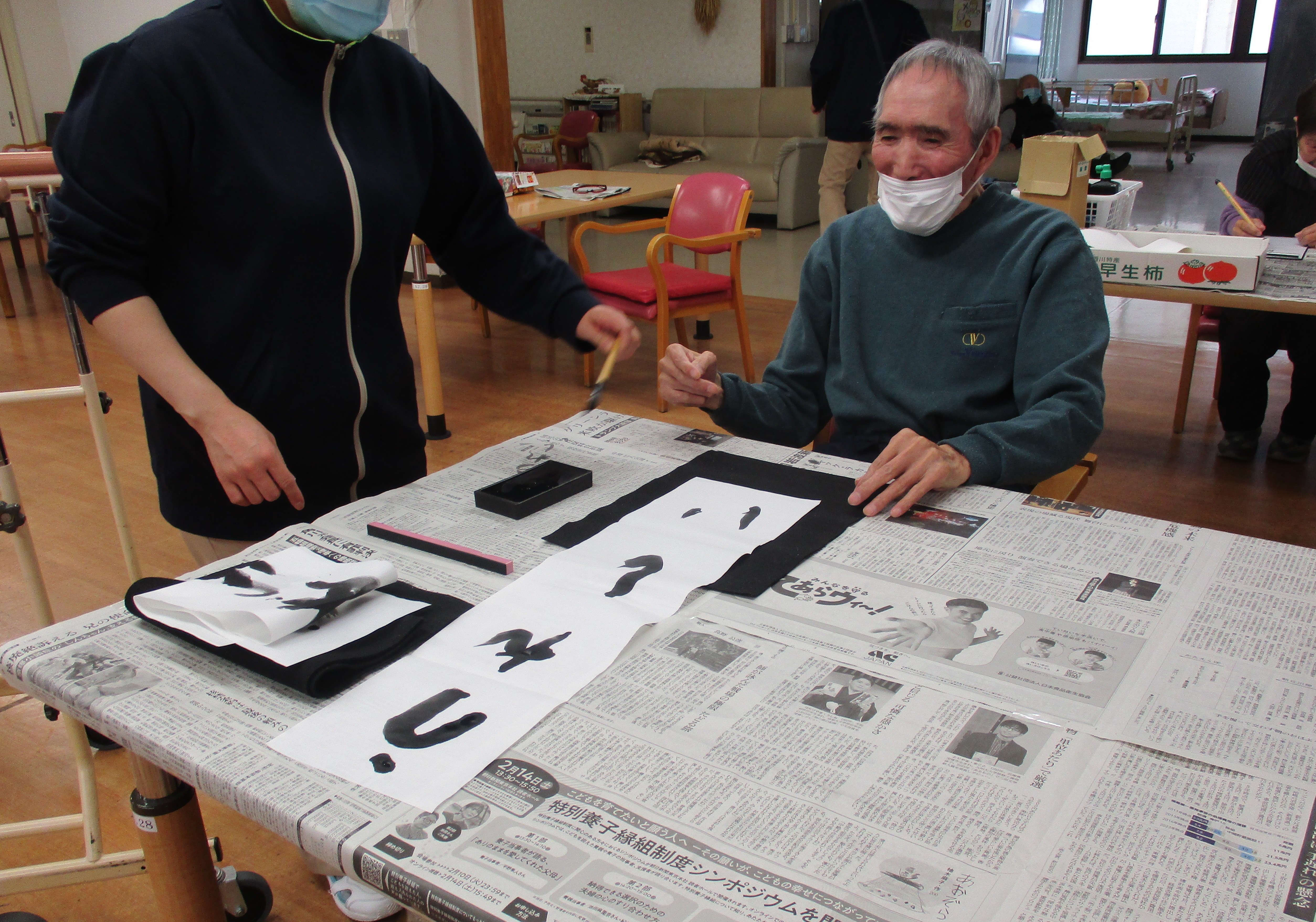 我がデイサービスでは、色々なゲームやアクティビティを楽しんでいただいていますが、今日は、ご利用者のリクエストにお応えし、「書道の日」開催ですっ♪