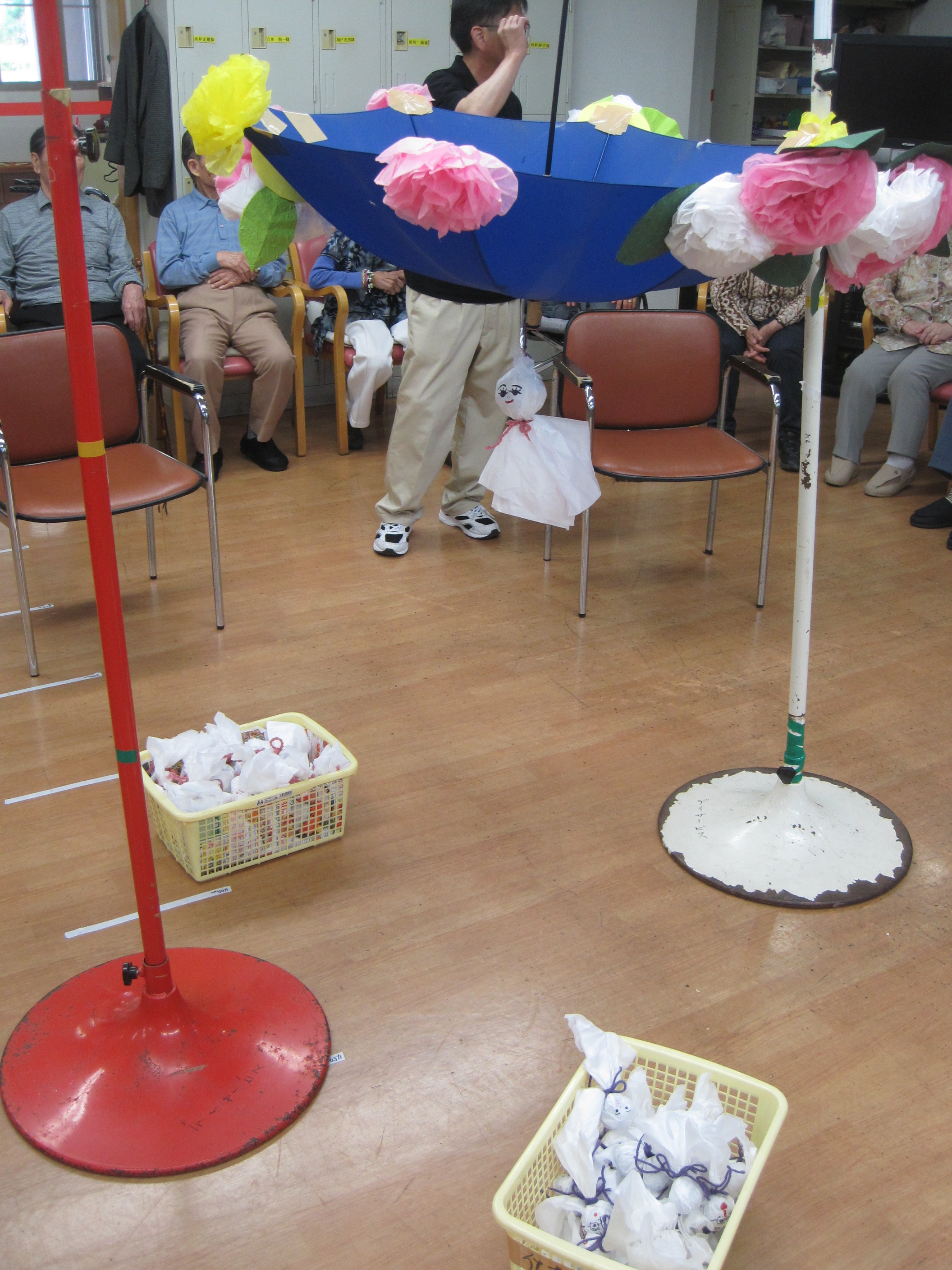 投げるタイミングが合わないと、上手く傘の中に゛てるてる坊主゛君が入りませんっ。