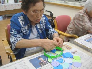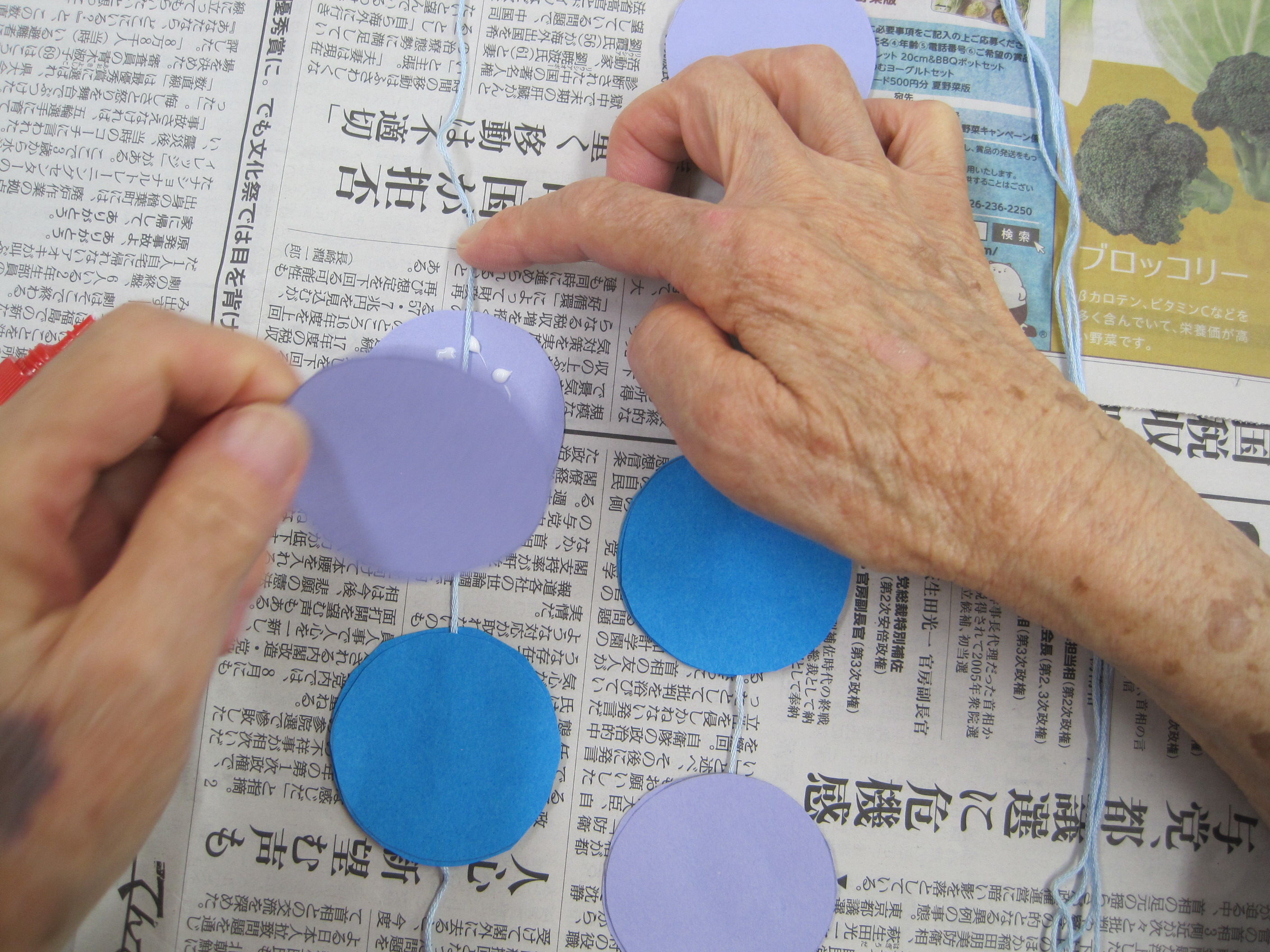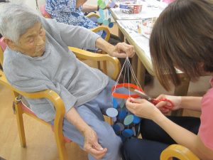 盆踊りの音楽が流れるデイサービスのフロアが、にぎやかなお祭りモード一色です。